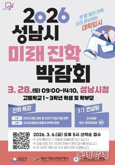 동네방네 김형규 기자 | 성남시청소년청년재단은 오는 3월 28일 오전 9시부터 오후 2시 10분까지 성남시청에서 '2026 성남시 미래진학박람회'를 개최한다고 밝혔다. 이번 박람회는 성남시 고등학교 1~3학년 학생과 학부모를 대상으로 진행된다.
