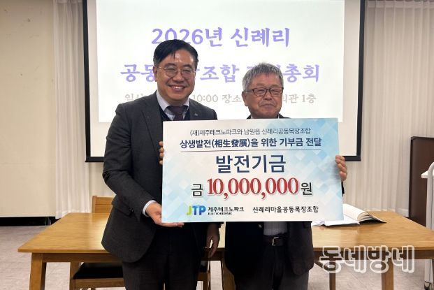 동네방네 김형규 기자 | 신례리공동목장조합(조합장 양춘식)과 20년 넘게 상생협력을 이어오고 있는 제주테크노파크(원장 지영흔, 제주TP)가 발전기금을 쾌척했다.