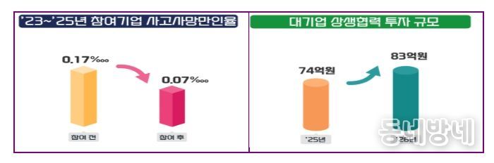 올해는 대기업 220곳이 중소기업 3,160곳과 함께 참여한다. 상생협력 투자 금액은 지난해보다 11.3%(74→83억 원) 증가할 예정이고, 사망·중상해 재해가 발생한 고위험 협력업체, 거래관계가 없는 지역 중소기업 등 안전관리 손길이 필요한 분야에 대한 지원을 강화한다.