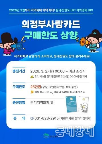 동네방네 김형규 기자 | 의정부시는 지역경제 활성화와 민생 안정을 위해 3월부터 의정부사랑카드(지역화폐) 월 구매 한도를 기존 15만 원에서 25만 원으로 상향한다.