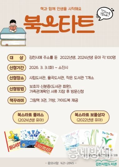 동네방네 김형규 기자 | 김천시립도서관(관장 이신기)은 오는 3월 3일부터 관내에 주소를 둔 유아들에게 생애 처음 책꾸러미를 선물하는 '북스타트'를 운영한다.