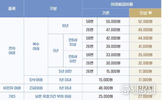 또한 1회 사용 가능한 단수여권은 15,000원에서 17,000원으로, 긴급한 사유로 발급되는 비전자여권인 긴급여권은 48,000원에서 50,000원으로 조정된다.
