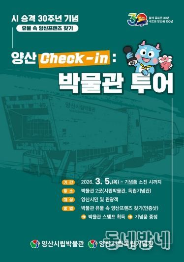 동네방네 김형규 기자 | 양산시립박물관(관장 신용철)은 시 승격 30주년 및 양산 방문의 해를 맞아 3월 5일부터 양산시민 및 관광객을 대상으로 박물관 투어 특별 이벤트를 운영한다고 밝혔다.
