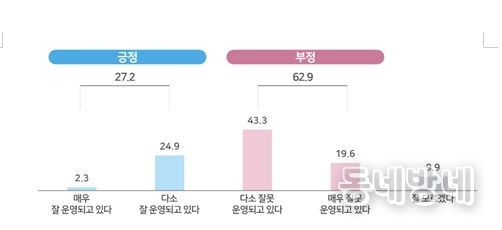 또한 현재 형사사법 서비스에 대한 국민의 평가는 부정의견이 62.9%로 긍정의견 27.2%보다 크게 앞섰다.