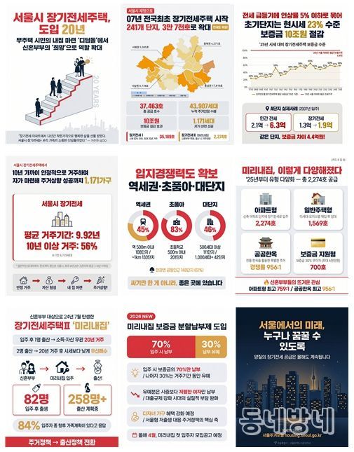 동네방네 김형규 기자 | 서울 대표 주거사다리 ‘장기전세주택’의 입주자들은 작년 한 해만 보증금 약 10조 원을 절감한 것으로 나타났다. 또 지난 2024년 도입된 장기전세주택Ⅱ ‘미리내집’ 입주자 설문 결과, 응답자의 84%가 ‘향후 가족계획이 있다’고 답해 ‘저출생 극복’이라는 정책 취지에도 발맞춰 가고 있는 것으로 조사됐다.