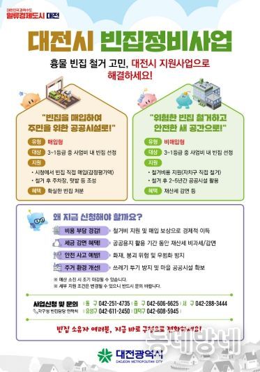 동네방네 김형규 기자 | 대전시는 도심 속 안전을 위협하고 주거 환경을 저해하는 빈집을 정비하기 위한 2026년 빈집 정비사업 대상지를 모집하고 있다.