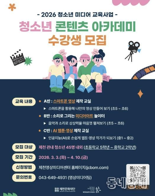 동네방네 김형규 기자 | 제천문화재단은 2026년 청소년 영상제작 교육사업'청소년 콘텐츠 아카데미'를 운영하고 수강생을 모집한다.