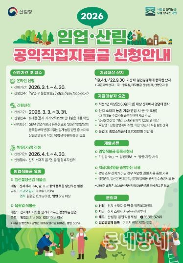 동네방네 김형규 기자 | 영천시는 2026년 임업·산림 공익직접지불금 신청을 3월 4일부터 4월 30일까지 접수한다고 밝혔다.
