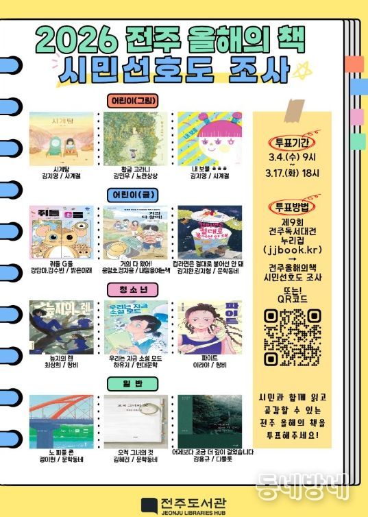 시는 오는 17일까지 약 2주간 2026년 한 해 동안 시민과 함께 읽고 공감할 ‘2026 전주 올해의 책’ 최종 선정을 위한 온라인 시민 투표를 진행한다고 4일 밝혔다.