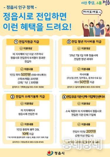 먼저 시는 타 지자체에서 정읍으로 터전을 옮기는 시민들을 위해 전입지원금을 대폭 상향했다. 기존 15만원이었던 지원금을 최대 50만원으로 확대해 전입 후 6개월이 지나면 20만원, 1년이 경과하면 30만원 등 총 2회에 걸쳐 정읍사랑상품권으로 지급한다. 변경된 제도는 2025년 7월 1일 이후 전입자부터 적용된다.