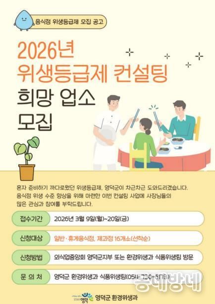 동네방네 김형규 기자 | 영덕군은 지역 음식점의 위생 수준을 높이고 외식 환경의 경쟁력을 강화하기 위해 올해 ‘음식점 위생 등급제 컨설팅’ 사업에 참여 업소를 오는 9일부터 20일까지 선착순으로 모집한다.
