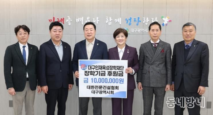 동네방네 김형규 기자 | 대구시교육청은 3월 5일 대한전문건설협회 대구광역시회가 장학금 1천만원을 대구인재육성장학재단에 기탁했다고 밝혔다.