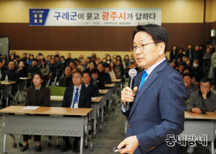 동네방네 김형규 기자 | 광주광역시는 6일 구례군 백두대간생태교육장 세미나실에서 ‘광주전남 통합 구례군 상생토크’를 열고, 구례 발전 전략과 통합 이후 변화에 대해 구례군민들과 소통했다.