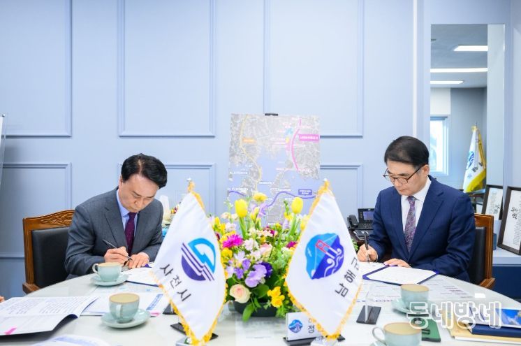 장충남 남해군수와 박동식 사천시장은 6일 남해군청에서 ‘사천우주항공선 국가철도망 구축’을 위한 공동 건의문을 채택하고, 국토교통부가 수립 중인 ‘제5차(2026~2035) 국가철도망 구축계획’ 에 해당 노선의 반영을 공식 요청했다.