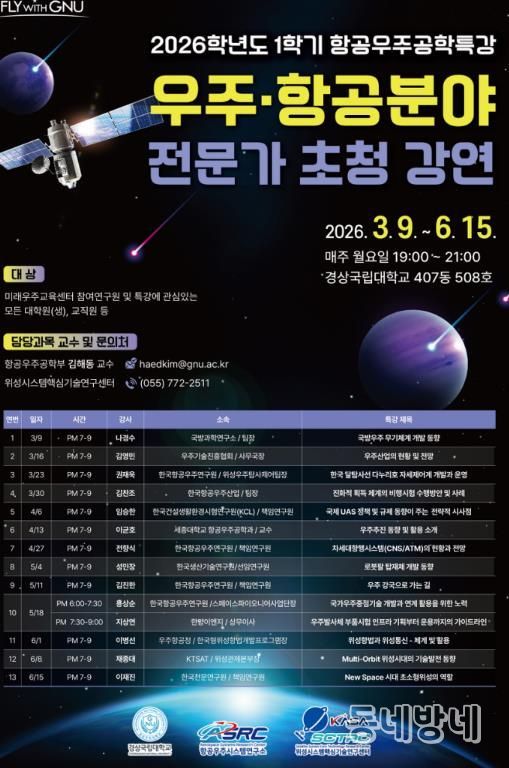 동네방네 김형규 기자 | 경상국립대학교 위성시스템핵심기술연구센터는 3월 9일부터 6월 15일까지 13차례에 걸쳐 우주‧항공 분야 전문가 초청강연을 진행한다.