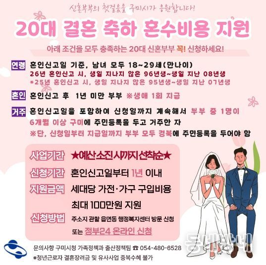 김장호 구미시장은 “결혼 부담을 줄이는 일은 행정의 역할”이라며 “청년과 신혼부부가 구미에서 미래를 설계하도록 실질적인 지원을 계속 확대하겠다”고 말했다.