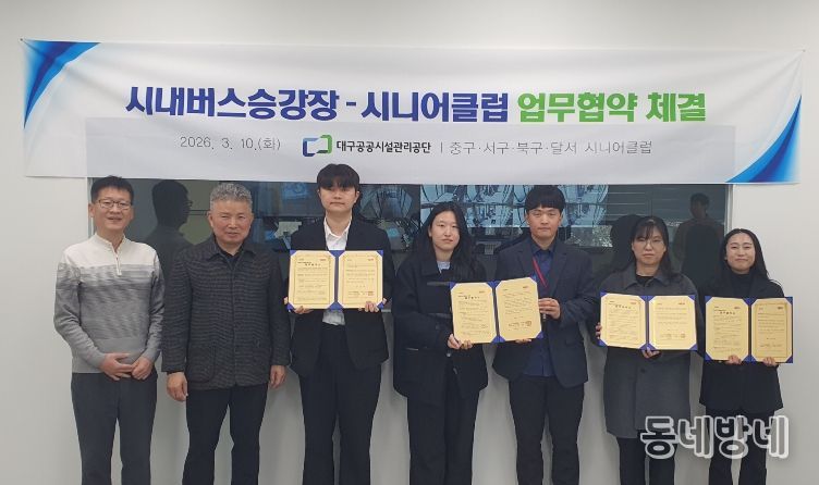 동네방네 김형규 기자 | 대구공공시설관리공단(이사장 문기봉) 시내버스유개승강장은 지난 3월 10일(화), 시내버스유개승강장 사무실에서 지역 4개 시니어클럽과 업무협약을 체결했다.