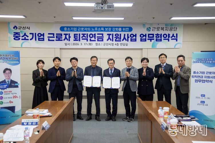 군산시는 17일 군산시청에서 근로복지공단과 ‘중소기업 근로자 퇴직연금 지원사업’ 추진을 위한 업무협약을 체결했다고 밝혔다. 이날 협약식에는 김영민 군산시장 권한대행과 성헌규 근로복지공단 의료복지이사를 비롯한 양 기관 관계자들이 참석했다.