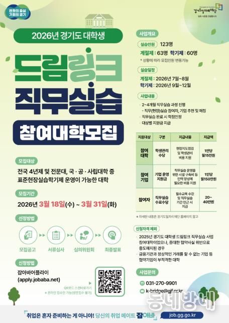 동네방네 김형규 기자 | 경기도와 경기도일자리재단이 ‘경기도 대학생 드림링크 직무실습’ 사업에 참여할 15개 협력대학을 31일까지 모집한다.