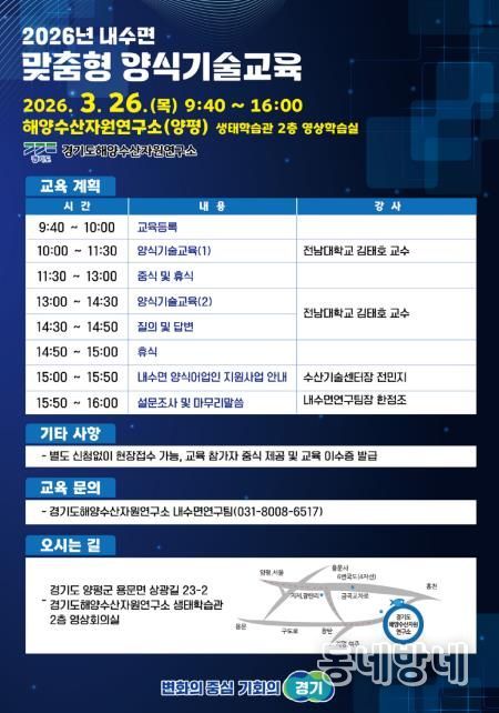 동네방네 김형규 기자 | 경기도해양자원연구소는 오는 26일 양평에 있는 연구소 생태학습관에서 내수면 양식 어업인의 역량 강화를 위한 양식기술교육을 실시한다.