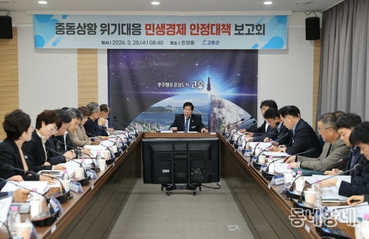동네방네 김형규 기자 | 고흥군은 25일 군청 흥양홀에서 군수 주재로 각 부서장이 참석한 가운데 ‘중동 상황 위기대응 민생경제 안정대책 보고회’를 개최하고, 최근 중동 상황으로 인한 경제위기 극복을 위한 분야별 대응 방안을 집중적으로 점검했다.