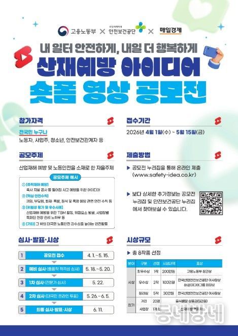 동네방네 김형규 기자 | 고용노동부는 한국산업안전보건공단, ㈜매일경제신문사와 함께 국민 누구나 참여할 수 있는 산재예방 아이디어 숏폼 영상 공모전를 개최한다.