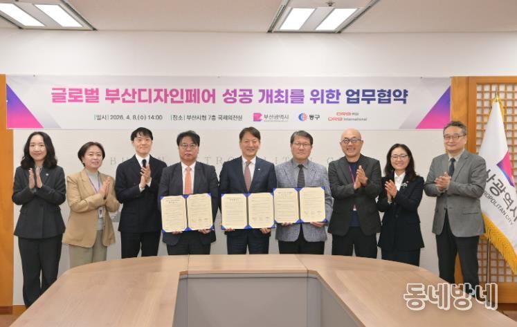 동네방네 김형규 기자 | 부산광역시 동구는 4월 8일 부산시청 국제의전실에서 부산광역시, 주식회사 디알비동일과 함께 ‘글로벌 부산디자인페어’ 추진을 위한 업무협약(MOU)을 체결했다고 밝혔다.