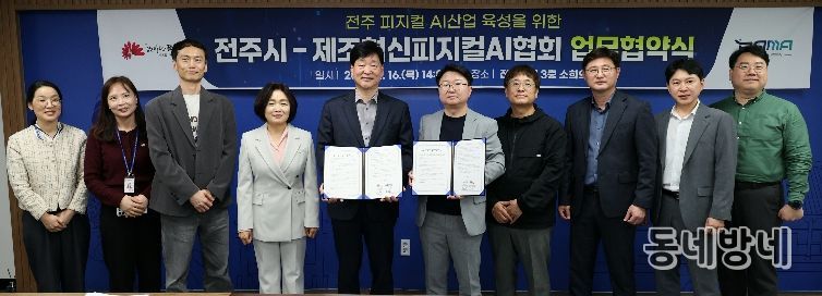 시와 제조혁신피지컬AI협회는 16일 시청 3층 소회의실에서 윤동욱 전주시장 권한대행 부시장과 조용로 협회장 등 양 기관 관계자들이 참석한 가운데 ‘피지컬 AI 산업 육성을 위한 업무협약’을 체결했다.