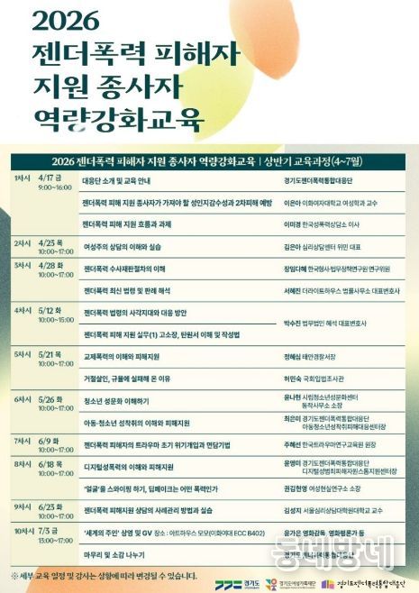 동네방네 김형규 기자 | 경기도와 경기도젠더폭력통합대응단이 17일 도내 젠더폭력 피해 지원 현장 종사자들의 전문성 향상을 위한 ‘2026 역량강화 교육’ 상반기 과정을 시작하며 현장 대응력 강화에 나섰다.