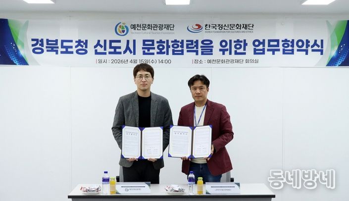동네방네 김형규 기자 | (재)한국정신문화재단과 (재)예천문화관광재단이 안동과 예천을 잇는 광역 연계 생활권 기반 문화협력의 물꼬를 텄다. 양 기관은 지난 15일 예천군문화회관에서 ‘경북도청 신도시 문화협력을 위한 업무협약(MOU)’을 체결하고, 공동 문화사업 추진을 위한 상호 협력 체계를 구축했다고 밝혔다.