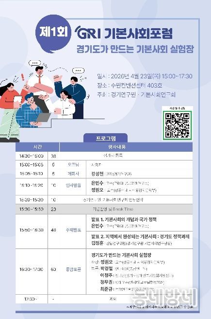 동네방네 김형규 기자 | 경기연구원은 오는 23일 오후 3시 수원컨벤션센터 403호에서 ‘경기도가 만드는 기본사회 실험장’을 주제로 ‘제1회 GRI 기본사회포럼’을 개최한다.