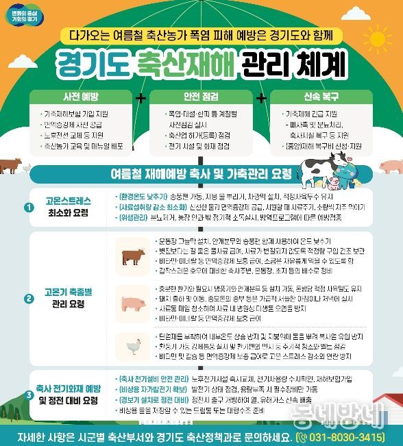 동네방네 김형규 기자 | 경기도가 올여름 무더위로부터 축산농가를 보호하기 위해 예산 지원과 현장점검을 아우르는 전방위적 대응에 나섰다.