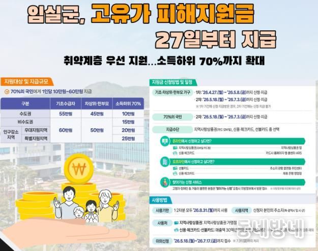 동네방네 김형규 기자 | 임실군이 최근 중동지역 긴장 고조에 따른 고유가‧고물가 상황 속에서 군민들의 생활안정을 지원하기 위해 ‘고유가 피해지원금’을 지급한다.