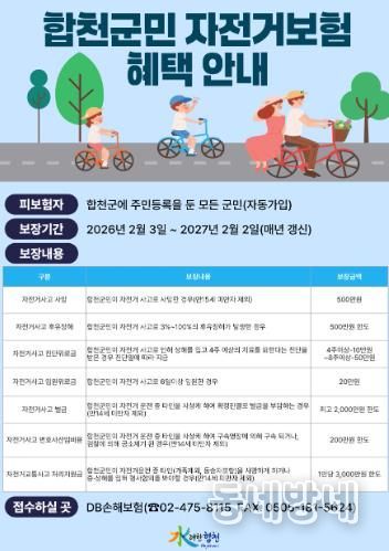동네방네 김형규 기자 | 합천군은 군민들의 자전거 이용 활성화와 안전사고에 대비하기 위해 ‘2026년 합천군민 자전거 단체보험’에 가입했다고 22일 밝혔다.