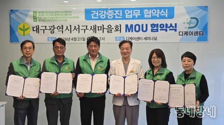 동네방네 김형규 기자 | 대구광역시서구새마을회는 지난 4월 21일 오후 2시, 디케어센터 세미나실에서 디케어센터와 서구새마을회지도자 및 가족의 건강증진과 복지 향상을 위한 상호협력 업무협약(MOU)을 체결했다.
