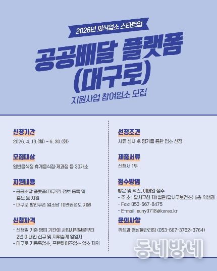 동네방네 김형규 기자 | 대구 달서구는 신규 외식업소의 조기 정착과 경영 안정화를 돕기 위해 ‘2026년 외식업소 스타트업 공공배달 플랫폼 지원사업’을 추진한다.