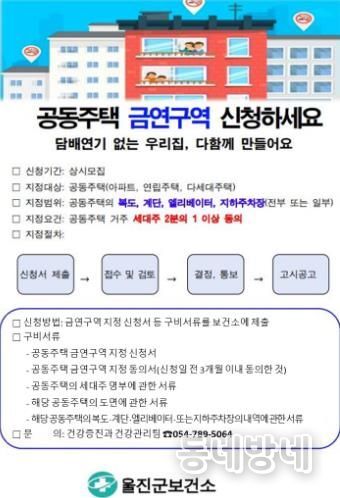 동네방네 김형규 기자 | 울진군은 금연환경 조성 및 쾌적한 주거환경 조성을 위해 관내 공동주택을 대상으로‘공동주택 금연구역 지정’을 연중 신청받는다.