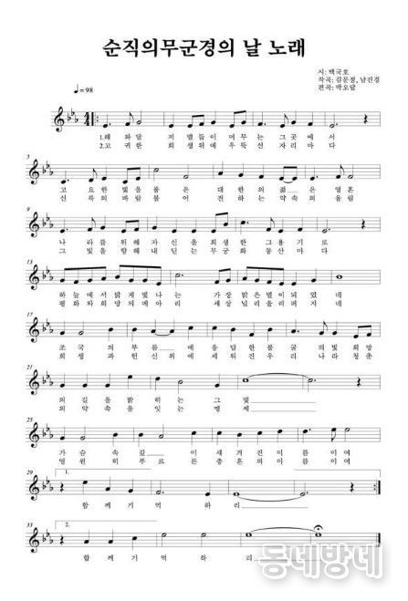 끝으로, 제1회 정부 기념행사를 개최하며 제작한 기념곡 ‘순직의무군경의 날 노래’를 가수 라포엠과 대학생연합합창단의 선도로 참석자 모두가 제창하며 기념식이 마무리된다.