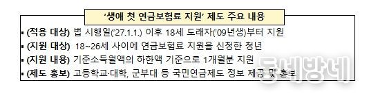 아울러 첫 보험료 지원으로 국민연금 가입자가 된 후에는 두루누리 보험료 지원, 저소득 지역가입자 보험료 지원, 실업크레딧 등 다양한 지원 제도의 혜택을 받을 수 있다.