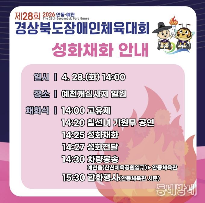 동네방네 김형규 기자 | 예천군은 오는 28일, 예천과 안동이 공동으로 주관하는 ‘제28회 경상북도장애인체육대회’의 시작을 알리는 성화 채화식을 예천 개심사지에서 개최한다.