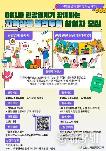 동네방네 김형규 기자 | 고령문화관광재단은 GKL사회공헌재단과 협력하여 오는 5월 30일부터 31일까지 이틀간 ‘GKL 지역상생 볼런투어’를 경상북도 고령 일대에서 운영한다고 밝혔다.