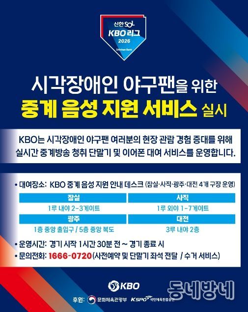 동네방네 김형규 기자 | KBO는 2023년부터 잠실, 사직, 광주 구장에서 운영해 온 ‘KBO 리그 시각장애인 현장 관람객 대상 중계 음성 지원 서비스’를 올해 대전 한화생명 볼파크까지 확대해 총 4개 구장에서 운영한다.