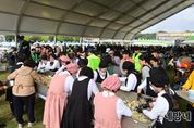 동네방네 김형규 기자 | 봉화군은 지난 16일 제29회 봉화송이축제 개막식에서 진행된 ‘제4회 오색오미 대형 비빔밥 퍼포먼스’가 성황리에 마무리됐다고 밝혔다. 이번 퍼포먼스는 봉화의 대표 농·축산물인 송이버섯과 한약우를 주재료로 활용해 500인분 규모의 대형 비빔밥을 조리해 관광객과 군민들에게 나누는 행사로, 축제의 서막을 화려하게 열었다. 준비된 비빔밥을 함께 비비고 나누며 화합과 풍요의 의미를 되새기는 시간이 됐다. 비빔밥 재료 손질부터 조리, 배식까지는 봉화군 우리음식연구회 회원들이 직접 참여해 정성을 더했으며, 향긋한 송이향과 한약우의 풍미가 어우러져 방문객들의 입맛을 사로잡았다. 특히 우리음식연구회는 이번 송이축제 기간 동안 전통음식 판매 부스도 함께 운영하며 봉화의 맛과 멋을 전했다. 부스에서는 ▲찰떡 ▲시골감주 ▲사과·딸기찹쌀떡 ▲쌀아이스크림 등 지역 농산물을 활용한 다양한 전통 간식이 판매되고 있으며 특히 사과·딸기 찹쌀떡은 전통의 맛에 현대적 감각을 더한 메뉴로, 관광객들로부터 큰 인기를 끌었다. 최순자 봉화군 우리음식연구회 회장은 “올해도 많은 분들이 송이