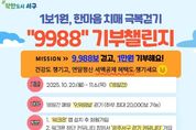 동네방네 김형규 기자 | 광주광역시 서구가 오는 20일부터 11월 6일까지 18일간, 치매 인식 개선과 기부문화 확산을 위한 ‘1보1원, 한마음 치매극복걷기 9988 기부챌린지’를 진행한다. 이번 챌린지는 치매상담콜센터 홍보와 함께 주민 참여를 통해 치매 극복에 대한 지역사회의 관심을 높이기 위해 기획됐다. 치매상담콜센터는 연중무휴로 전문상담사가 맞춤형 상담을 제공하는 서비스로 ‘18세 기억을 99세까지, 99세까지 팔팔(88)하게’라는 의미를 담고 있다. 참가자는 ‘워크온(Walk On)’ 앱을 활용해 하루 평균 9988보를 달성할 경우 ‘1만원 기부권’을 받을 수 있으며 챌린지 종료 후 만족도 조사와 기부 동의 절차를 완료하면 기부권이 서구 관내 취약계층 치매환자 가구에 전달된다. 서구는 총 300명의 챌린지 달성자를 목표로 하며 누적 기부금 300만 원은 치매환자 30가구에 각 10만 원씩 전달할 예정이다. ‘9988 챌린지’ 참여가 어려운 주민은 하루 동안 1만보를 걷고 1만 원을 기부하는 ‘1보1원 순수기부’에 참여할 수 있다. 김이강 서구청장은 “치매는 개인의 문