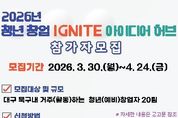 동네방네 김형규 기자 | 대구 북구청은 지역 청년들의 창업 열정과 혁신적인 아이디어 발굴을 지원하기 위해 오는 4월 24일까지 '청년 창업 Ignite 아이디어 허브' 참가자 20팀을 모집한다. 이번 사업은 지역 청년 (예비)창업자들이 보유한 창업 아이디어에 ‘점화(Ignite)’의 계기를 제공하여 사업화 가능성을 구체화하고 현실화할 수 있도록 단계별로 지원할 예정이다. 참가 대상은 2026년 청년놀이터 멤버십 회원 또는 창업놀이터 입주기업, 현재 39세 이하(1986년 3월 31일 이후 출생)인 북구 지역 청년 (예비)창업자이다. 북구 거주자․북구 소재 기업 재직자․북구 소재 대학생(휴학생)․북구 관내 창업 3년 미만 기업 중 1개 이상 요건을 충족하면 참가할 수 있으며, 이메일로 신청하면 된다. 선발된 팀에는 월 2회 이상의 협업 공간 이용 지원, 팀당 활동비 50만 원이 지원되며, 성과발표회를 통해 상위 7팀에는 총 310만 원 규모의 시상금이 수여될 예정이다. 배광식 북구청장은 “청년이 가진 아이디어 하나가 미래를 밝히는 불꽃이 될 수 있도록 지속적으로 청년이 도전할 기회를 제공하고 대구 북