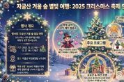 동네방네 김형규 기자 | 의령 자굴산 자연휴양림은 오는 25일부터 27일까지 3일간 ‘자굴산 겨울 숲 별빛 여행’을 개최한다고 밝혔다. 이번 행사는 연말 가족 여행객과 휴양림 방문객을 위한 겨울맞이 특별 프로그램으로, 체험과 공연 등 남녀노소 모두 즐길 수 있는 다채로운 콘텐츠가 준비되어 있다. 특히 12월 중순부터는 노각센터 앞에 대형 화이트 트리가 설치돼 휴양림 전체가 크리스마스 분위기를 물씬 풍기며, 방문객들에게 더욱 특별한 겨울 정취를 선사할 전망이다. 행사는 자굴산 자연휴양림 노각센터 일원에서 진행되며, 프로그램은 시간대별로 자유롭게 참여할 수 있다. 대표 프로그램으로는 문양을 새겨 만드는 우드버닝 체험, 수제 쿠키 및 블록 트리 만들기, 달고나 체험, 유아를 위한 에어바운스 운영, 코믹 매직 벌룬쇼 등 다양한 체험과 공연이 펼쳐져 관람객에게 즐거움을 선사할 예정이다. 의령군 관계자는 “겨울 숲 속에서 가족과 함께 따뜻하고 특별한 시간을 보내실 수 있도록 알찬 프로그램을 준비했다”며 “연말을 맞아 자굴산 자연휴양림에서 행복한 추억을 만들어 보시길 바란다. 또한 자체 제작한 4계