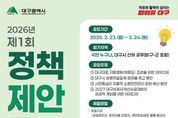 동네방네 김형규 기자 | 대구광역시는 전 국민과 시 산하 공무원의 창의적인 정책 아이디어를 발굴해 시정 발전의 동력으로 활용하고자 ‘2026년 제1회 정책제안 공모’를 개최한다. 이번 공모는 총 4개 분야를 주제로 진행된다. ▲대구 대표 지방정원(하중도) 조성을 위한 아이디어 ▲ 대구시 승용차요일제 참여율 제고 방안 ▲시민 중심의 자발적 소방안전관리 문화 확산 방안 ▲2027 대구세계사격선수권대회의 성공 개최 방안이다. 공모 기간은 2월 23일부터 3월 24일까지 30일간이며, 대한민국 국민이라면 누구나 참여할 수 있다. 제안은 대구시 온라인 참여 플랫폼 ‘토크대구’, 국민신문고, 우편, 방문, 팩스 등을 통해 접수 가능하며, 자세한 사항은 대구시청 홈페이지 공고 게시판에서 확인하면 된다. 접수된 제안은 업무 담당부서에서 창의성과 실시 가능성 등을 기준으로 채택 여부를 사전 검토하고, 이후 제안실무위원회 심의를 거쳐 우수 제안 후보를 선정한다. 선정된 후보에 대해서는 5월 초 시민이 직접 참여하는 온라인 투표 점수(30%)와 전문가로 구성된 제안심사위원회 심사 점수(70%)를 합산해