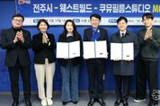 동네방네 김형규 기자 | 대한민국 대표 영화도시인 전주시가 글로벌 영화영상산업 수도로 도약하기 위해 세계적인 영상 제작 인프라를 보유한 국내·외 기업들과 손을 맞잡았다. 시와 웨스트월드(대표 손승현), 쿠뮤필름스튜디오는 19일 시청 3층 소회의실에서 우범기 전주시장과 손승현 웨스트월드 대표, 양수연 쿠뮤필름스튜디오 본부장 등이 참석한 가운데 ‘전주시 영화영상산업 발전 및 투자를 위한 양해각서(MOU)’를 체결했다. 이번 협약은 시가 추진 중인 ‘글로벌 영화영상산업 수도’ 조성의 핵심 거점을 마련하고, 국내외 유수 기업의 기술력과 네트워크를 전주에 이식하기 위해 추진됐다. 이 자리에서 3개 기관은 △쿠뮤필름스튜디오 전주시 투자 확정 △웨스트월드 전주 지사 설립 △영화·영상 등 콘텐츠 기업에 대한 투자 활성화에 적극 협력하기로 약속했다. 협약에 참여한 웨스트월드는 ‘오징어 게임’, ‘좀비딸’, ‘다 이루어질 지니’와 같은 글로벌 히트작의 시각효과(VFX) 제작에 참여한 국내 최고의 기술력을 보유한 기업이다. 이 기업은 특히 넷플릭스와 기술 파트너십을 체결할 만큼 독보적인 비주얼 퀄리티를 자랑한다. &n