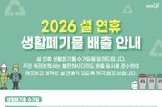 동네방네 김형규 기자 | 양주시가 설 연휴 기간 시민과 방문객의 불편을 줄이기 위해 ‘2026년 설 연휴 생활폐기물 관리 대책’을 추진한다. 양주시는 설 연휴가 시작되는 오는 2월 14일부터 18일까지를 특별 관리 기간으로 정하고, 연휴 기간 중 급증하는 생활폐기물로 인한 불편을 최소화할 방침이다. 시는 종량제봉투, 음식물류 폐기물, 재활용품 등 생활폐기물을 2월 14일과 16일 이틀간 정상 수거한다. 공동주택에서 발생하는 음식물류 폐기물은 2월 18일 별도 수거해 연휴 기간 배출된 폐기물이 장기간 방치되는 것을 막을 계획이다. 또 연휴 기간 중 쓰레기 민원과 긴급 상황에 신속히 대응하기 위해 상황근무반을 편성하는 등 비상 청소체계를 구축·운영한다. 양주시 관계자는 “설 연휴 기간 생활폐기물 발생을 줄이기 위한 시민들의 적극적인 협조가 필요하다”며 “생활폐기물은 정해진 수거 일정에 맞춰 배출해 주시고, 수거일 전날 오후 8시부터 수거일 당일 오전 6시까지 배출 시간을 반드시 지켜달라”고 당부했다.