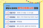 동네방네 김형규 기자 | 광양시는 각종 축제와 국제행사에서의 통역 지원과 외국인 민원 안내 등 다양한 분야에서 통역 봉사에 참여할 시민 외국어 통역자원봉사자를 2월 9일부터 2월 27일까지 모집한다고 밝혔다. 모집 대상은 공고일 기준 광양시에 거주하는 만 19세 이상 시민으로, 영어·중국어·일본어를 비롯한 기타 외국어 구사가 가능하면 누구나 신청할 수 있다. 선발된 통역자원봉사자는 매화축제 등 광양시 주요 축제와 각종 대형 행사에서 외국인 대상 현장 안내 및 통역을 지원하게 되며, 관내 기관·업체 협조 요청에 따른 통역 지원, 외국인 관광객 및 광양시 거주 외국인을 대상으로 한 안내·민원 협조 등 다양한 활동을 수행하게 된다. 시는 통역자원봉사자에게 자원봉사 실적 입력 및 관리 서비스를 제공하고, 활동 우수자에 대해서는 표창 또는 감사패 수여, 향후 광양시 명예통역관 위촉 시 우선 고려하는 등 인센티브를 제공할 계획이다. 아울러 국내 통·번역 특성화 대학과 연계해 통역자원봉사자의 전문성을 높이기 위한 온라인 통역 교육도 운영할 예정이다. 신청은 시 누리집 공고·공지사항에서 신청서를 내려